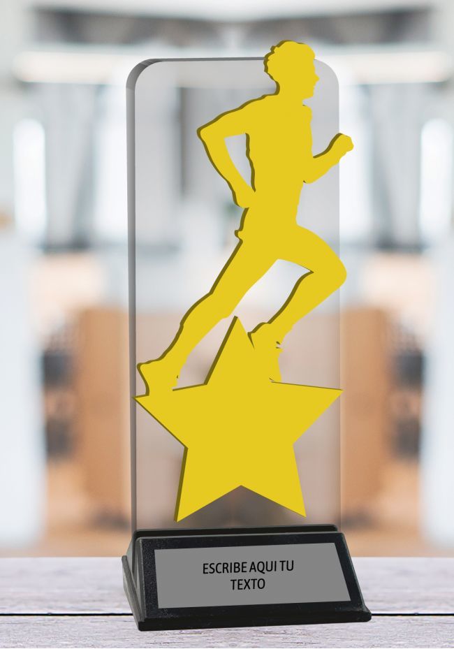 (21.03€ sin I.V.A.)Trofeo de acrílico con penana de madera. Relaizado en metal con 2 siluetas.
